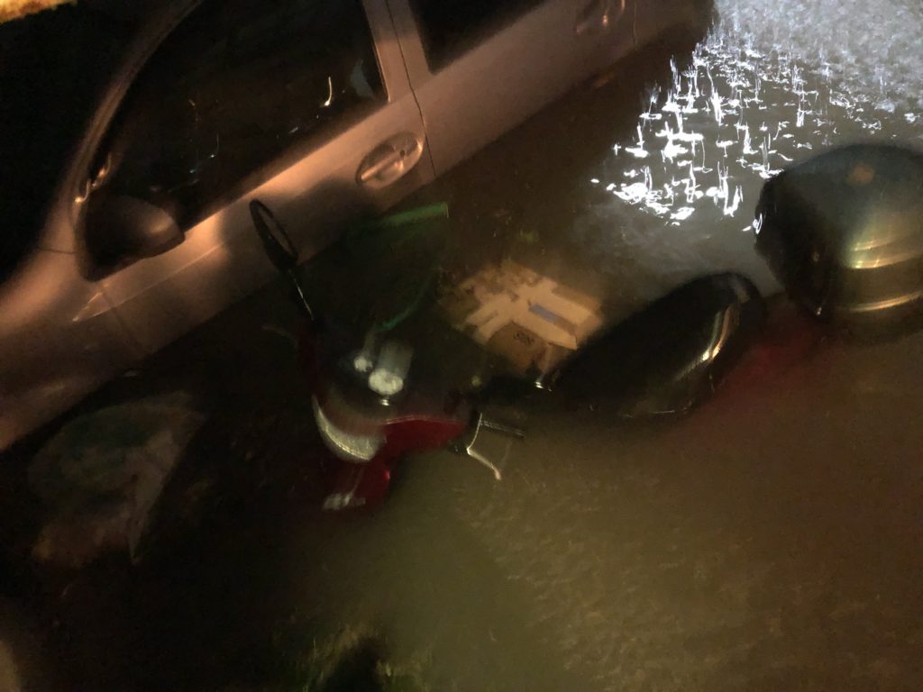 ウチは静岡市葵区ですが、その猛烈な雨のせいで写真のような状態です。ちょうどピークくらいで、水深1mくらいでしょうか。この後、雨が弱まって水位が下がり始めました。